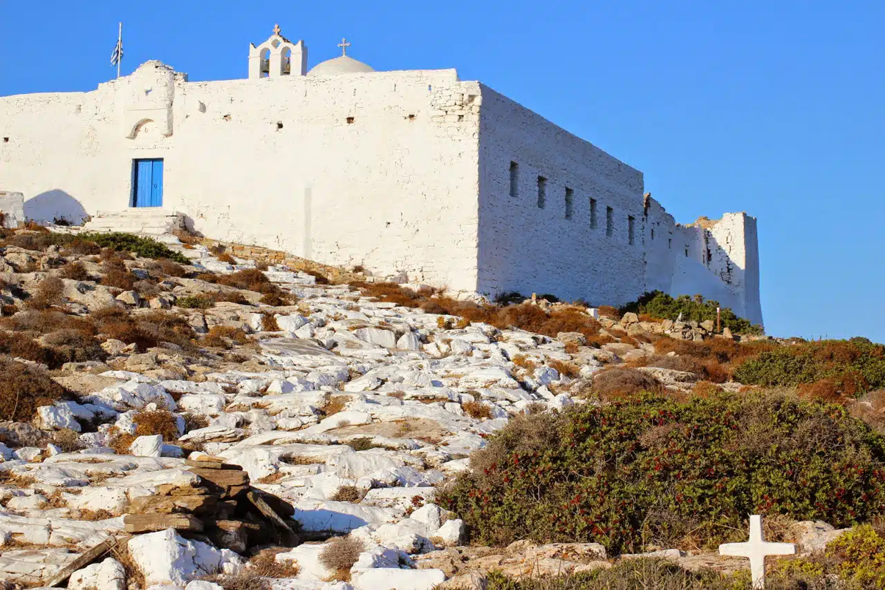 Avant d’arriver au monastère, sur la gauche il y a l’église de Panagia Panta Hara, c’est une petite église, un vœu du poète Odysseas Elytis, qui, bien qu’il n’ait jamais visité l’île, a laissé comme condition dans sa volonté la création du temple spécifique.