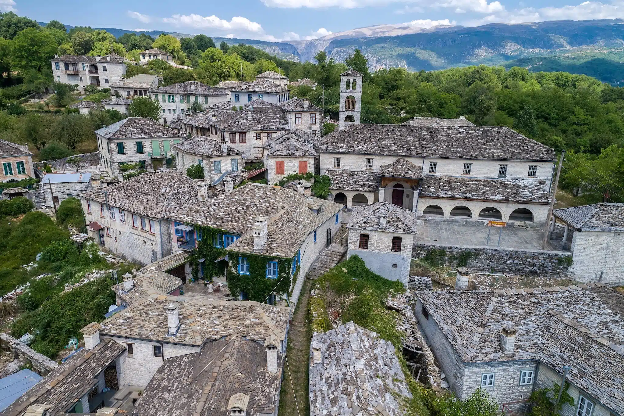 Plus au nord, l’Épire atteint sans doute son expression la plus spectaculaire avec la région du Zagoria (📍). On y découvre un ensemble de quarante-six villages de pierre, les Zagorochoria, qui forme un paysage culturel unique, inscrit au patrimoine mondial de l’UNESCO. Ici, la pierre est omniprésente : maisons, toits, chemins pavés et surtout les célèbres ponts en arc, comme ceux de Kokkori ou de Plakidas, construits pour franchir torrents et ravins.