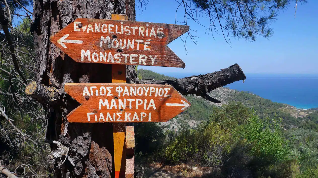 Découpée de falaises abruptes, la côte sud de l’ile est plus sauvage et moins habitée. Cela reste une région aux panoramas à couper le souffle [vue 360°] ou règne calme et sérénité. Peu d’infrastructures touristiques même à Magganitis ou Karkinagri sinon quelques kafenio ou tavernes ouvertes en saison. C’est la magnifique plage de Seychelles, qui tient son nom de la couleur de la mer à cet endroit, plus belle plage de la côte sud qui attire les foules. On y arrive après dix minutes de marches depuis la route qui la surplombe ou mieux en petit bateaux au départ du petit port de Magganitis.